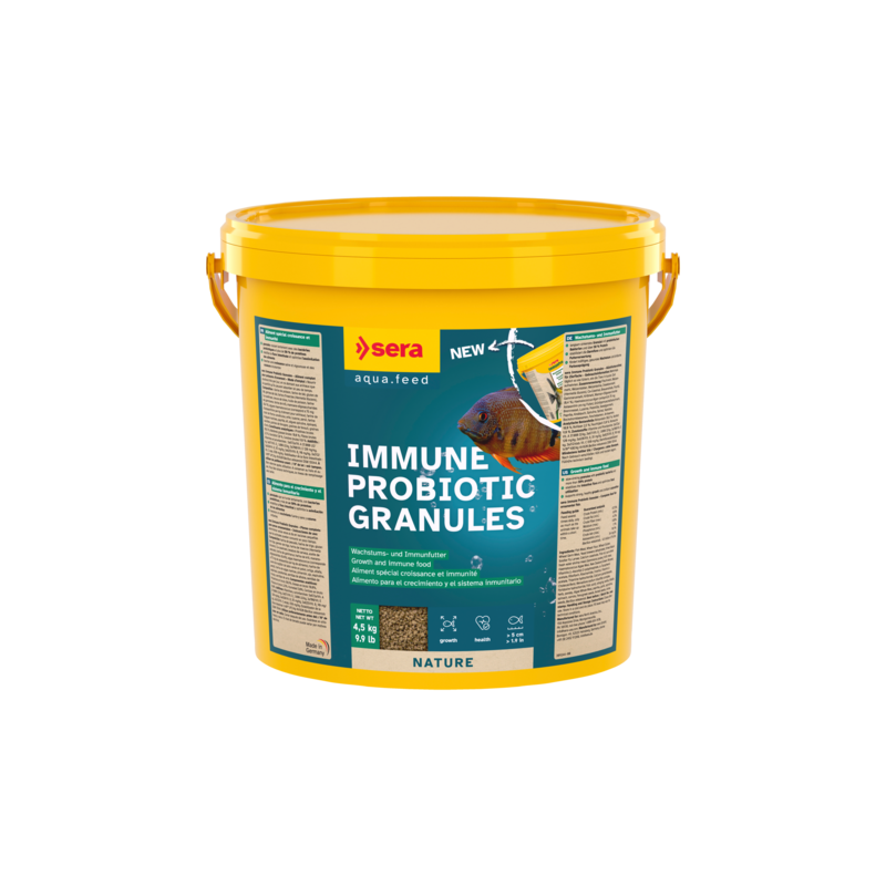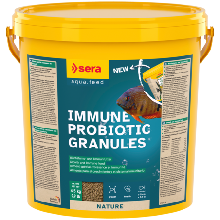 sera ImmunPro est l’aliment Pro spécial élevage descendant lentement au fond, pour tous les poissons d’ornement à partir de 4 cm. Les probiotiques, ajoutés à l’aliment selon un procédé spécial, stabilisent la flore intestinale des poissons d’ornement et assurent, étant donné l’assimilation plus efficace de l’aliment, une pollution réduite de l’eau. Grâce à sa haute teneur en protéines (plus de 50 %) et à l’addition de probiotiques et d’autres ingrédients fonctionnels, tels que les mannanes-oligosaccharides (MOS), Haematococcus et Spiruline, l’aliment Pro spécial élevage favorise la croissance rapide, le développement fort et l’éclat des couleurs des poissons.